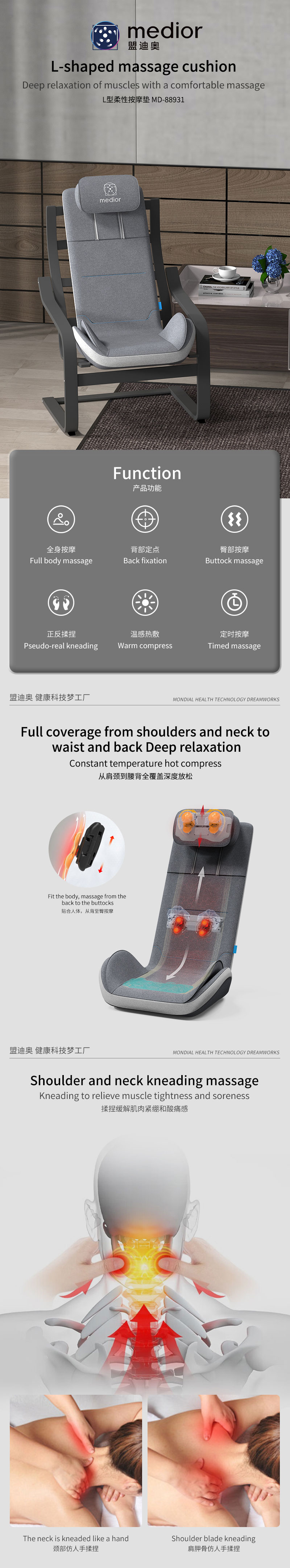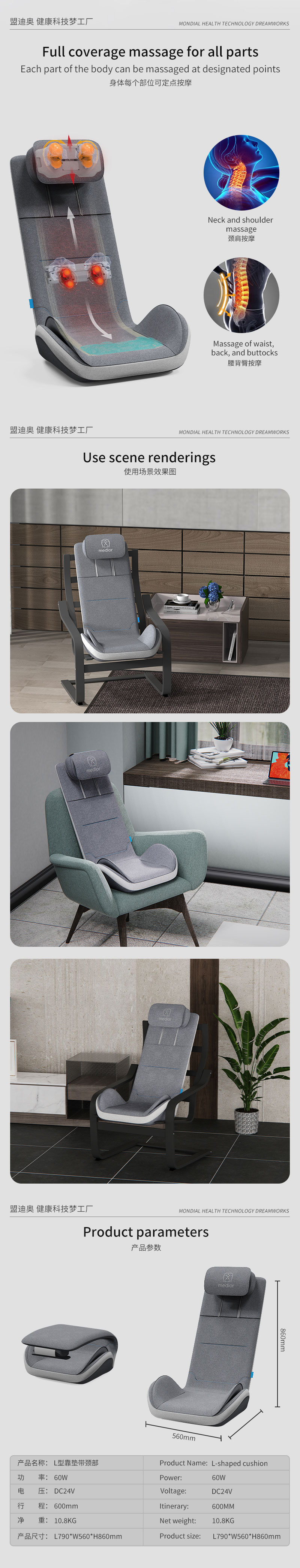 1、L型機芯結構,對折包裝縮小體積2、獨家專利柔性機芯3、力度三檔調節(jié),定點按摩,腰背按摩、臀腿按摩、全背按摩模式選擇4、背部行走揉捏,按摩區(qū)域加長到從肩膀到大腿;5、更加貼合不同款式的椅子整體可對折收納