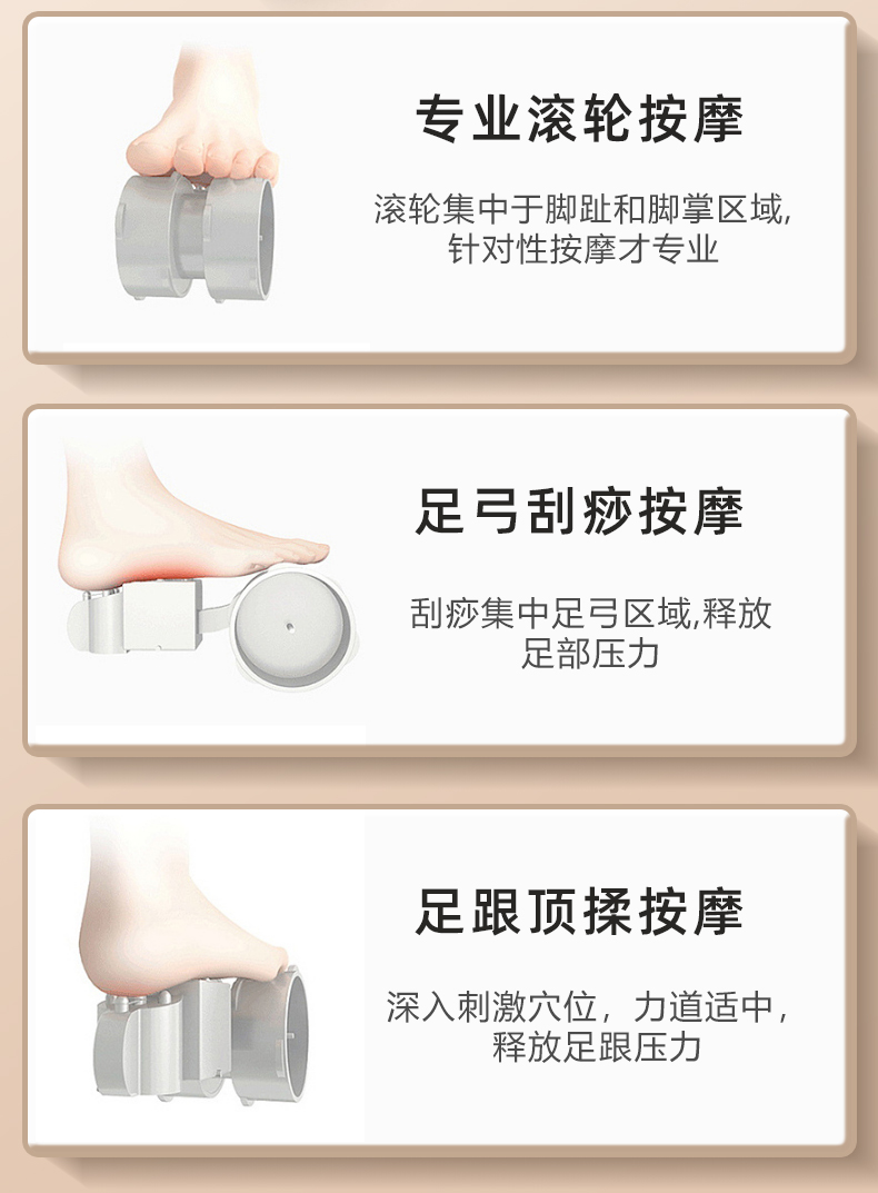 腳底 滾輪按壓(腳趾)、拖(腳底)、頂(腳后跟)按摩 (多模式,多強度)