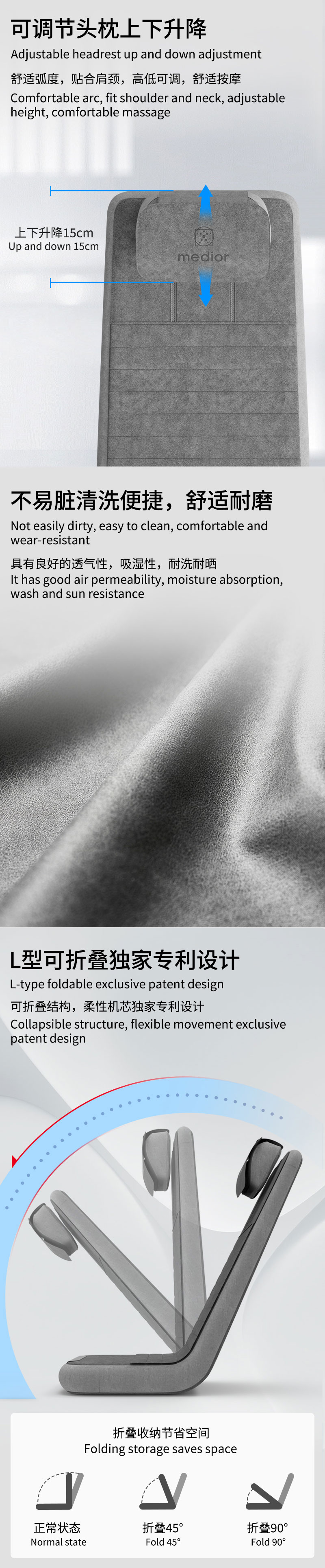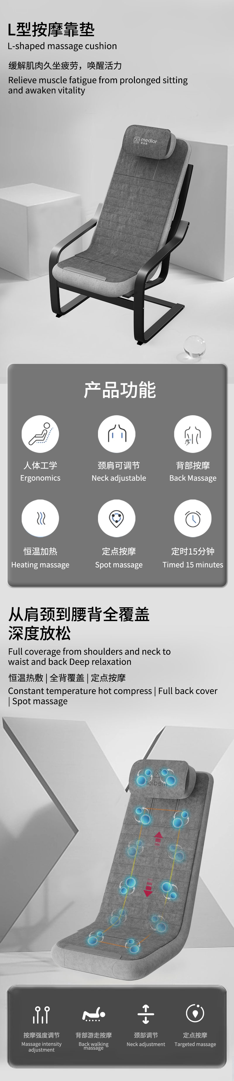 1、L型機(jī)芯結(jié)構(gòu),對(duì)折包裝縮小體積2、獨(dú)家專利柔性機(jī)芯3、力度三檔調(diào)節(jié),頸部揉捏,定點(diǎn)按摩,腰背按摩、臀腿按摩、全背按摩模式選擇4、頸部背部行走揉捏,按摩區(qū)域加長到從肩膀到大腿;5、更加貼合不同款式的椅子整體可對(duì)折收納6、亞馬遜標(biāo)準(zhǔn)包裝尺寸