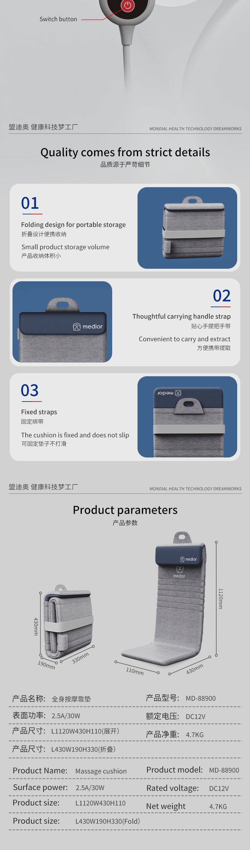 1、L型機(jī)芯結(jié)構(gòu),對(duì)折包裝縮小體積2、獨(dú)家專(zhuān)利柔性機(jī)芯3、力度三檔調(diào)節(jié),定點(diǎn)按摩,腰背按摩、臀腿按摩、全背按摩模式選擇4、背部行走揉捏,按摩區(qū)域加長(zhǎng)到從肩膀到大腿;5、更加貼合不同款式的椅子整體可對(duì)折收納